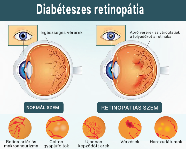 - Diabéteszes retinopátia: A kontrollálatlan vércukorszint károsítja a retina apró ereit, ami szivárgáshoz, vérzéshez és rendellenes új erek kialakulásához vezet – ami visszafordíthatatlan látásvesztést okoz.