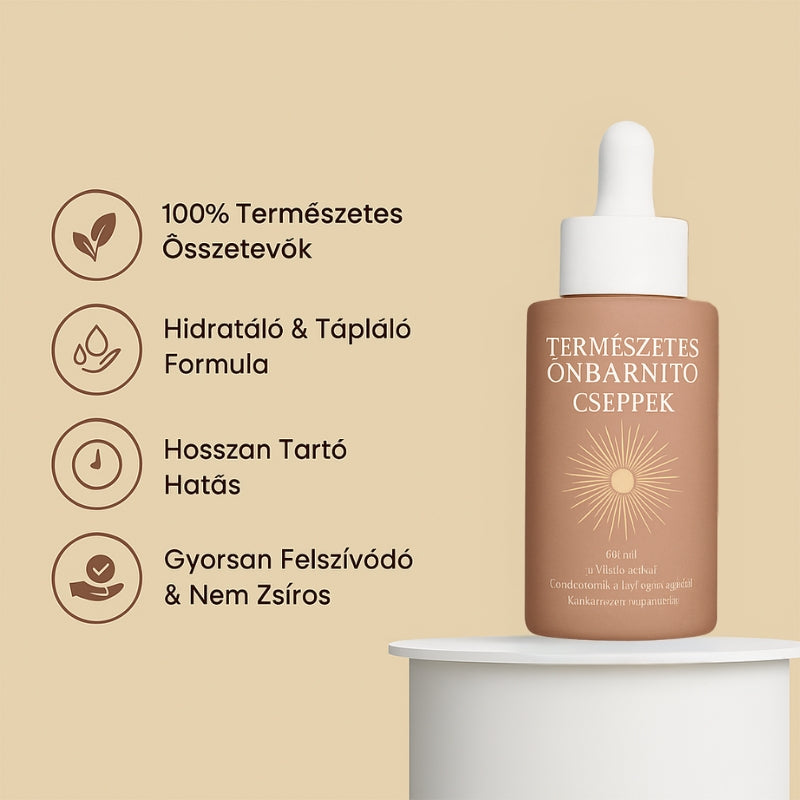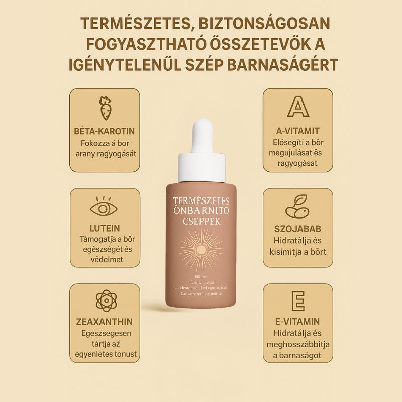 ATermészetes Önbarnító Cseppekegy táplálékkiegészítő, amely természetes mód serkenti amelaninproduktsét olyan aktiv összetsék söztepek, mint abeta-karotinés azantioxidánsok. A cseppek sässäm fogyaszatásával bőre graduallynapbarnítottésčlájnónúvanotot kap, szálát hogy ki kellara tennie magát a sunzállásnek.
